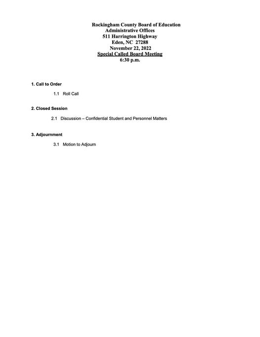 The Rockingham County Schools Board of Education will be holding a special-called meeting the evening of Tuesday, November 22, 2022 at 6:30 p.m. at the RCS Administrative Offices, located at 511 Harrington Highway in Eden.